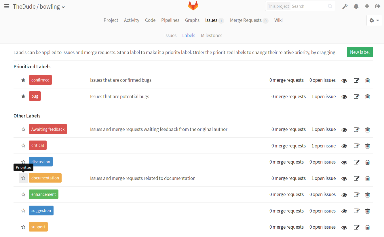 Once you start adding labels to your issues, you'll see the benefit of it. Labels can have several uses, one of them being the quick filtering of issues or merge requests.